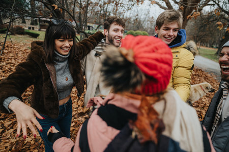 Group of friends enjoying a fun moment outdoors during a chilly autumn day