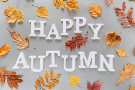 Happy autumn text from white letters and colored leaves on gray background. Autumn holiday concept. Top view Flat lay.