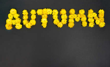 Word Autumn made of yellow flowering heads of chrysanthemums flowers. Fall. Handmade autumn minimal nature concept. Flat lay. Black background with copy space.