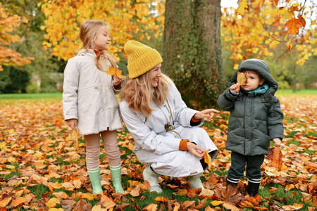 Hello autumn. smiling modern female in brown coat and yellow hat with autumn yellow leaves outdoors in the city park in autumn.