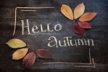 Hello autumn greeting text on chalkboard. Dark wooden school Board background with colorful maple leaves. Top view.