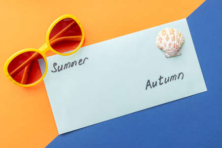 The inscription Autumn is written on a yellow leaf which fell into the green grass.