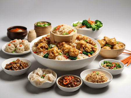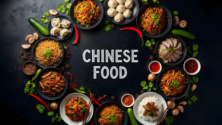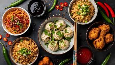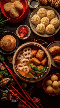 An overhead view showcasing a diverse collection of authentic chinese cuisine and ingredients