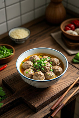 Enjoy a vibrant bowl of delicious Asian meatballs garnished with cilantro, surrounded by an array of fresh ingredients. Perfect for culinary inspirations!