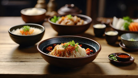 Explore a delightful arrangement of Asian dishes served around a wooden table featuring vibrant colors, fresh ingredients, and a communal dining experience.