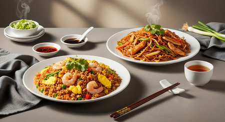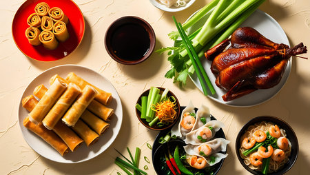 A festive table setting showcases a variety of Asian dishes including fried rice, spring rolls, and stir fried vegetables. Ideal for sharing with family during a special gathering.