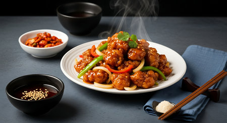 This stunning Asian cuisine platter features a vibrant array of sweet and sour dishes alongside fresh vegetables, showcasing colorful flavors and textures.
