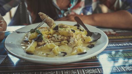 Closeup plate with portion of tasty pasta with cream sauce placed on table in restaurant