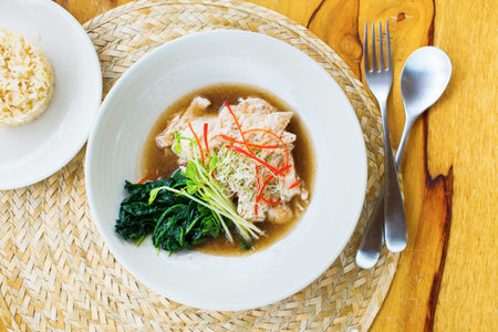 Baked chicken tender with boiling kale shitake Chinese gravy fresh sprouts Thai traditional food