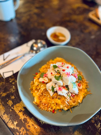 Traditional Thai spicy Noodle vermicelli with seafood shrimp squid and Thai herb on cook hand.