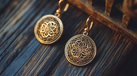 Captivating gold earrings featuring a delicate floral pattern, showcasing exquisite craftsmanship. The vintage design complements any style, resting elegantly on a dark wooden background.