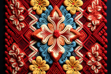 Colorful geometric embroidery pattern with intricate stitching and textile art design. That the image is generated using AI.