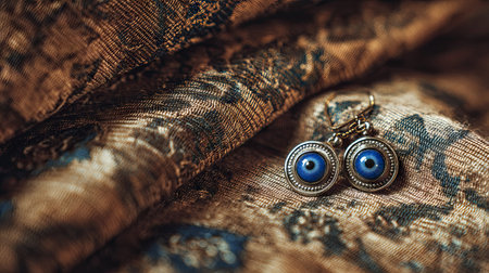 Captivating close-up of elegant blue earrings resting on a luxurious fabric, showcasing intricate patterns and rich textures, perfect for fashion enthusiasts.