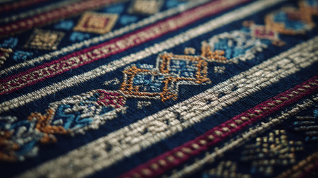 A stunning close-up view of an intricate textile pattern highlighting vibrant colors and unique embroidery, perfect for textile artists and designers seeking inspiration.