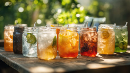 A collection of mason jars with iced drinks, arranged on a summer picnic table