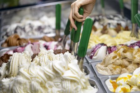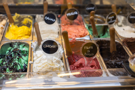 Colorful gelato selection displayed in a local dessert shop during summer in an urban area