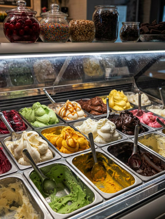 Colorful variety of ice cream flavors displayed in a bustling shop during a warm summer afternoon
