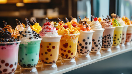 A beautifully arranged display of assorted bubble tea cups in various flavors, each adorned with unique toppings and colors, creating a visually appealing and inviting atmosphere.