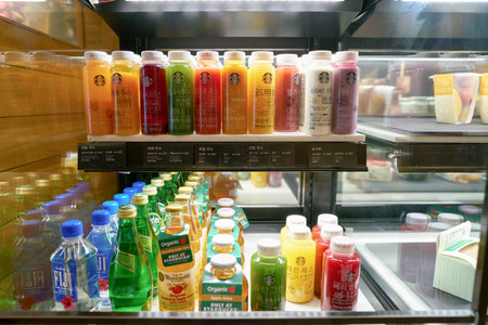 SEOUL, SOUTH KOREA - CIRCA JUNE, 2017: close up shot of ottle beverages at Starbucks in Seoul. Starbucks Corporation is an American coffee company and coffeehouse chain.