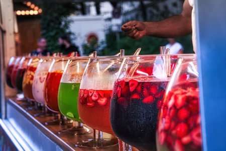 A vibrant array of exotic drinks displayed in transparent cups, showcasing the variety of colors and textures. Perfect for summer gatherings or themed parties.
