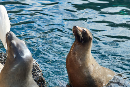 Sea lion raises its head near blue rippling water beside barnacled rocks. The marine mammal pauses calmly in a bright coastal habitat.
