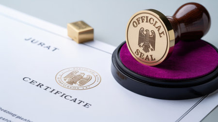 Top view of a clean, minimalist notary or legal office workspace with essential tools like a red sealed document, wax seals, stamps, and tablets. Perfect for legal services, contracts, finance, corporate themes, and official business.