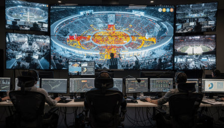 Heat map visualization on control room screen in a large stadium capturing realtime spectator movement during high attendance accompanied by focused operators monitoring alerts.