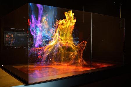 A vibrant and dynamic light show captivates viewers in an art installation with swirling colors.