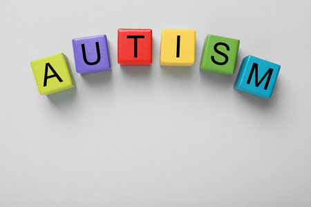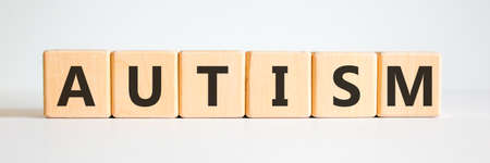 Autism symbol. Wooden cubes with the word 'autism'. Beautiful white background. Psychological, medical, business and autism concept. Copy space.
