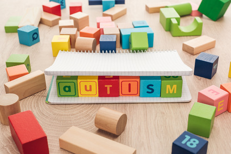 autism lettering made of multicolored cubes in notebook among building blocks on wooden surface