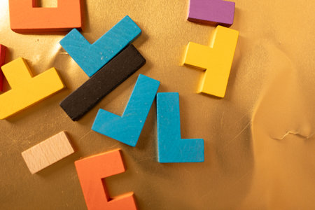Different colorful shapes wooden puzzle blocks on yellow background. Top view