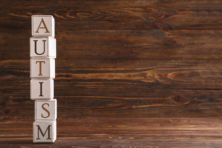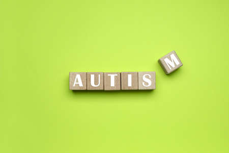 Word Autism is made of wooden cubes with letters. Concept of autism spectrum disorder ASD, healthcare for hospitals, clinics and medical business. Letters on a yellow background on top. Copy space.
