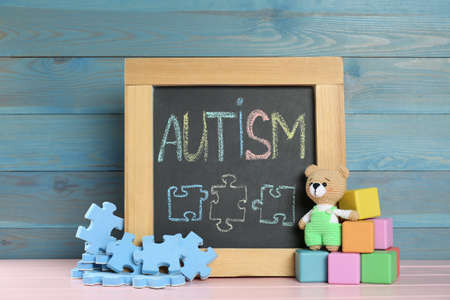 Small blackboard with word Autism and toys on pink wooden table