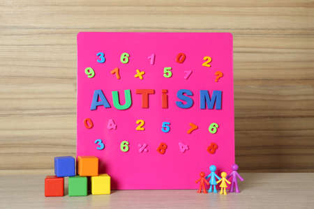 Magnetic board with word Autism, colorful cubes and human figures on wooden table
