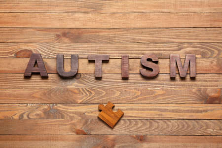 Word AUTISM and puzzle piece on wooden background