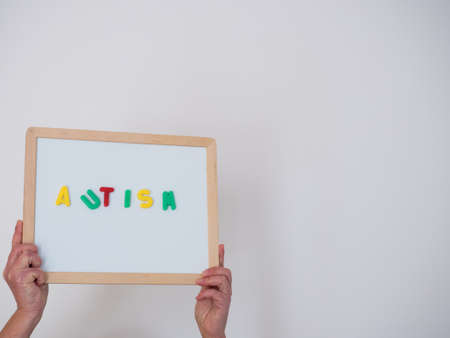 White board with the word autism, on a white background, held by hands. Health concept.