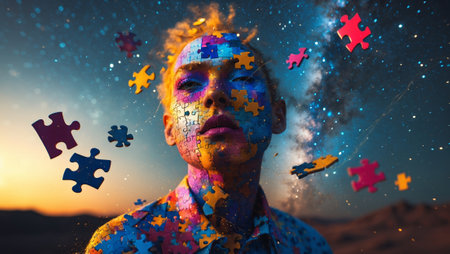 Colorful portrait of a person with puzzle pieces on their face against a starry sky at dusk
