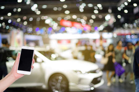 Hand holding mobile phone with indoor cars exhibition show blurred background and bokeh light, Social network, internet