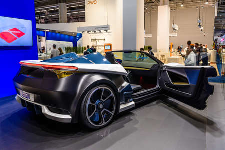 FRANKFURT, GERMANY - SEPT 2019: white black SEKISUI concept electric cabrio car, IAA International Motor Show Auto Exhibtion.