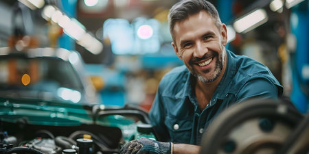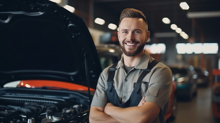 Portrait of a smiling mechanic working in a car repair shop.