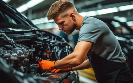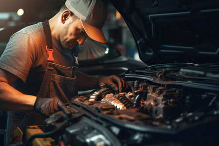 Automotive mechanic working on a car engine, performing vehicle repair and maintenance check with tools in a garage, ensuring proper functioning and service