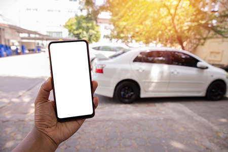 hand hold blank screen on mobile, cellphone, tablet on blurry white car. concept of find used card online.