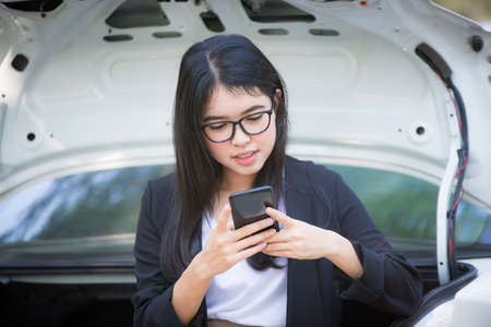 woman photographing his vehicle with damages for accident insurance with smart phone