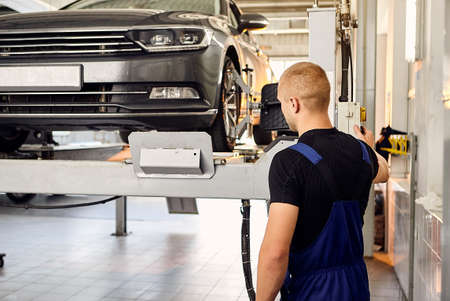 Ðuto mechanic sets the car for diagnostics and configuration collapse-convergence. Car Wheels alignment equipment on stand in a repair station.