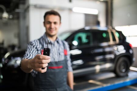 Smiling car service worker in uniform giving electronic key to happy client after repairing his automobile