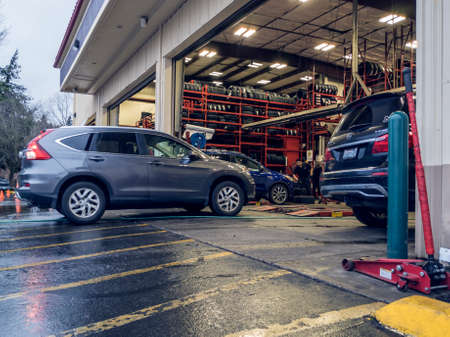 Kirkland, WA / USA - circa January 2020: View of a Discount Tire shop garage and mechanics hard at work maintaining cars.