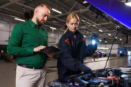 A young female car mechanic performs car diagnostics and shows the manager what needs to be repaired