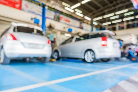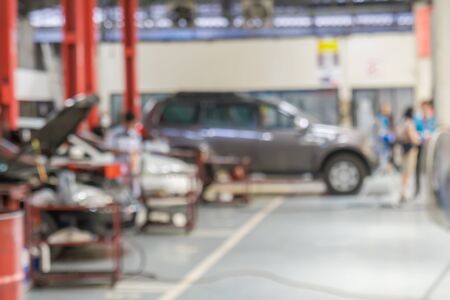 Blurred no focus background of car mechanic are checking cars. Blur image of young employees who are checking engines. Concept of quality inspection of cars Engine maintenance all the time.