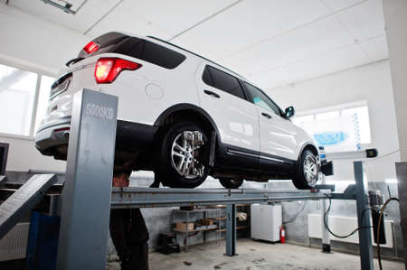 American SUV car on stand for wheels alignment camber check in workshop of service station.