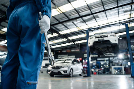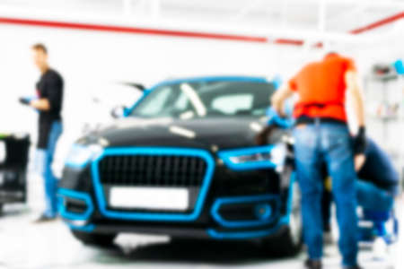 Blurred of car technician repairing the car in garage background.